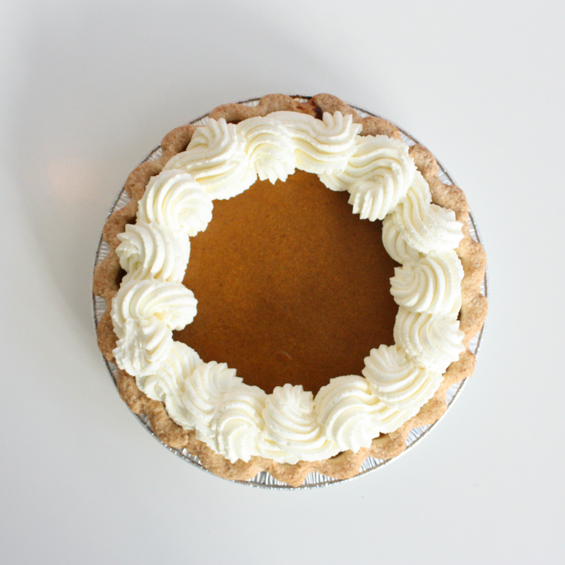 Traditional spiced pumpkin filling in a flaky crust. Includes a piped whipped cream border. Whole Pies available by pre-order after Labor Day through November with min. 48 hours notice (unless sold out). Best when enjoyed within 3 days of preparation. For best quality, we do not recommend freezingt his pie- please select frozen Take & Bake Pumpkin for longer shelf life.