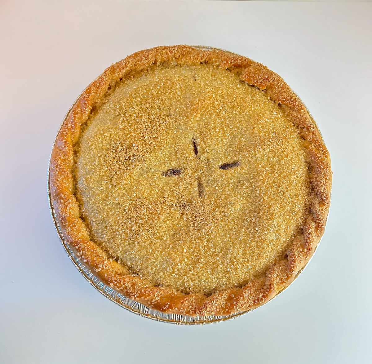 Our cherry filling is a mixture of tart & sweet cherries, cooked in a glaze until thick. Topped with our all-butter crust and raw crunchy sugar. Filling contains almond extract. Whole pies available by pre-order with 48 hours notice Jan-Oct. We do not recommend freezing this pie.