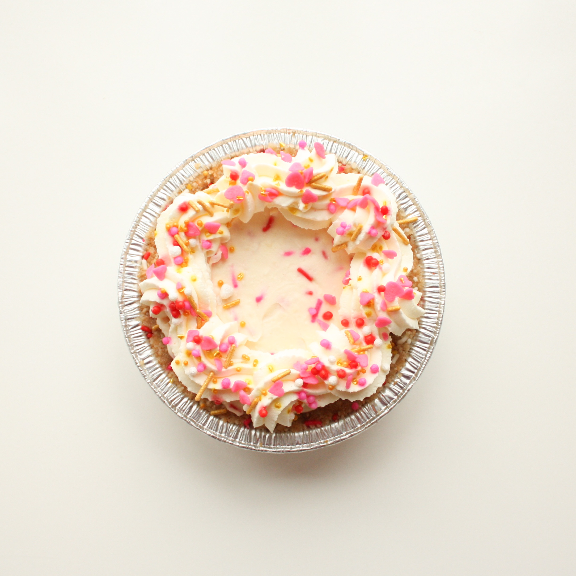 Valentine's Day Special! Our "Birthday Pie" with a Valentine's makeover in a 6" sharable cutie pie size. Vanilla wafer & sprinkle crust filled with confetti cake batter mousse. Topped with a fluffy piped whipped cream border and Valentine's themed sprinkles!
