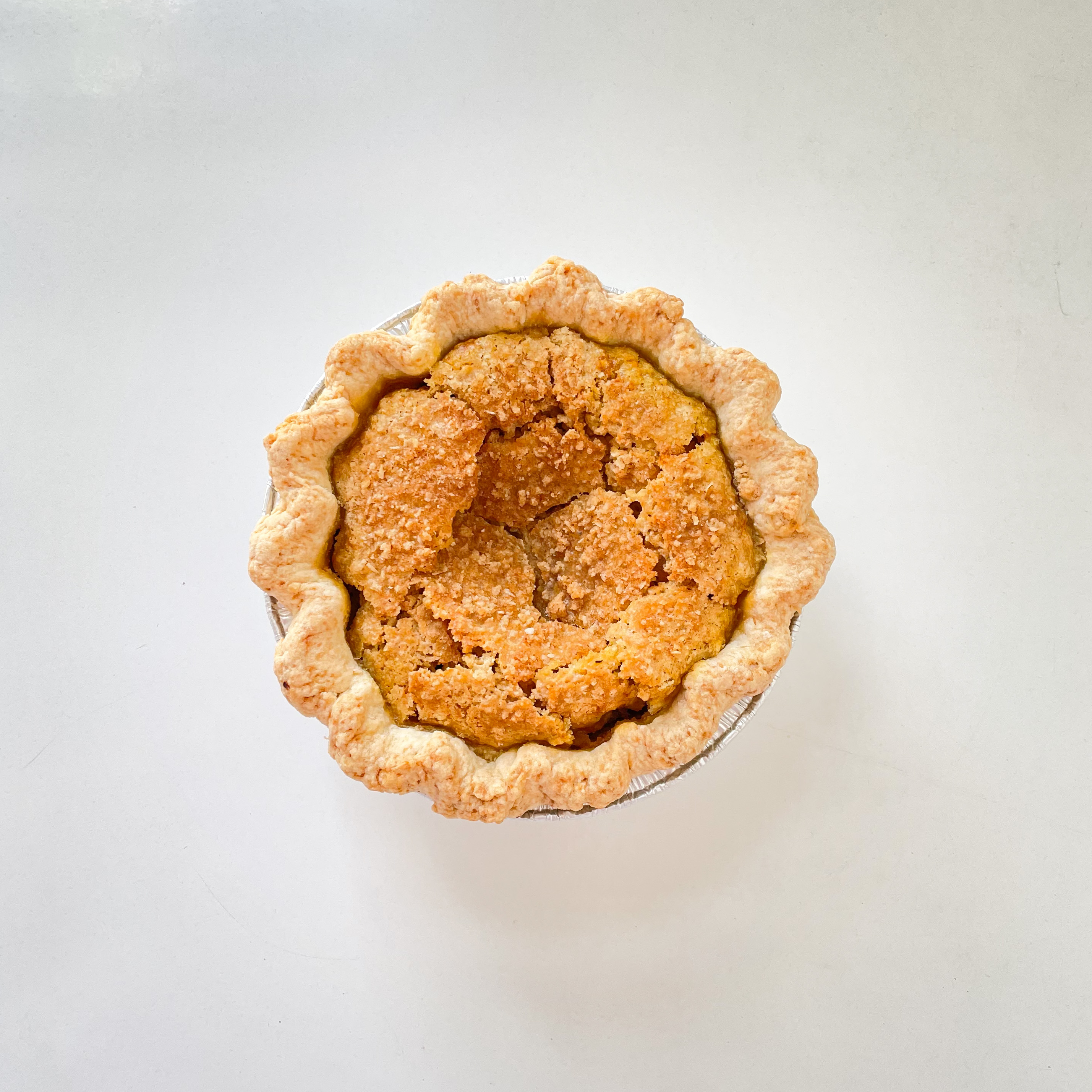 Our Pumpkin Crumble Pie in a 6" sharable cutie pie size. Spiced pumpkin filling in a flaky crust & topped with our brown sugar oat crumble. A crunchy spin on a traditional favorite! We don't recommend freezing this flavor.