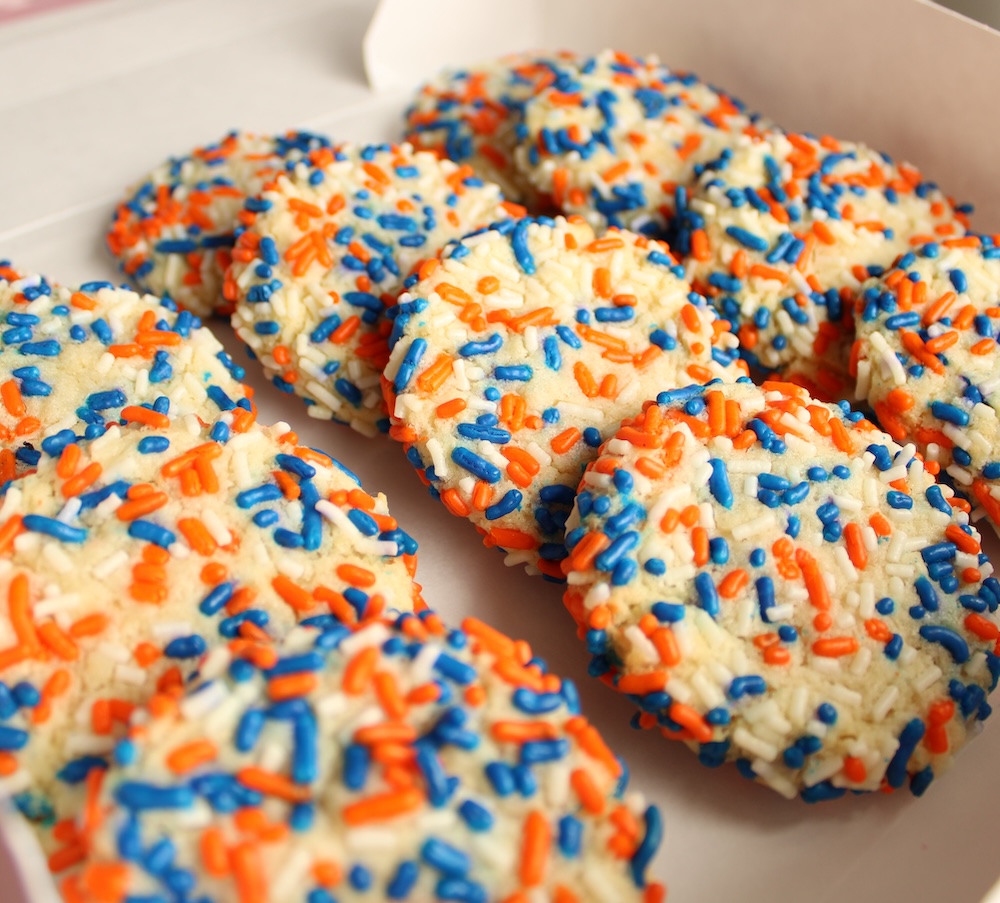 One dozen baked Spirit Sprinkle sugar cookies featuring scratch-made sugar cookie dough enveloped in our Orange + Blue sprinkle blend. A party in every bite! Best when enjoyed within 2-3 days after baking. Contact orders@piejunkie.com for custom sprinkle blend pre-orders and for individually packaged cookie orders.