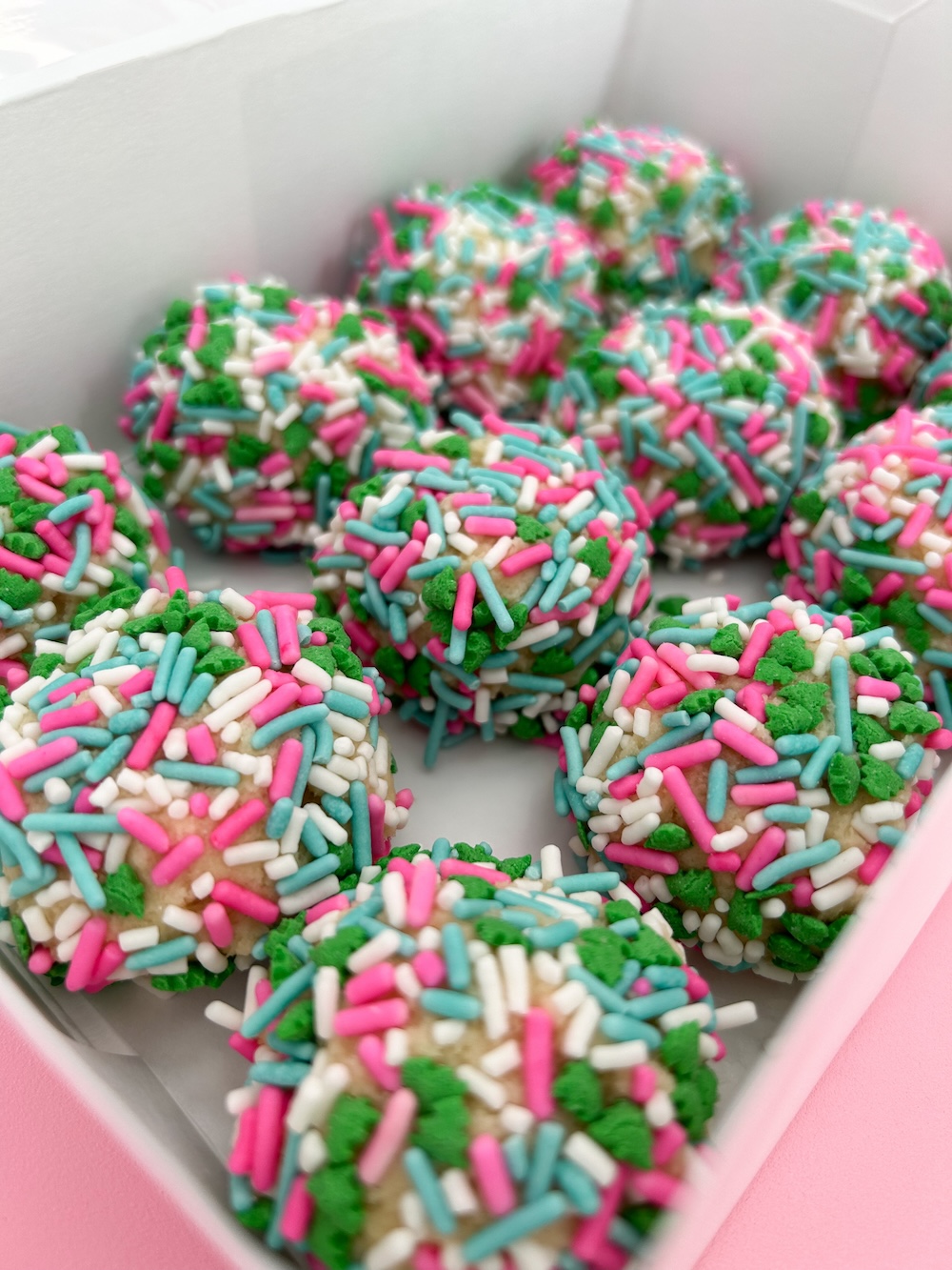One dozen Frozen Take & Bake Spirit Sprinkle sugar cookies featuring scratch-made sugar cookie dough enveloped in our holiday sprinkle blend. A party in every bite! Baking instructions included. Keep frozen until baking. Best when baked within one month of purchase and then enjoyed within 2-3 days after baking.