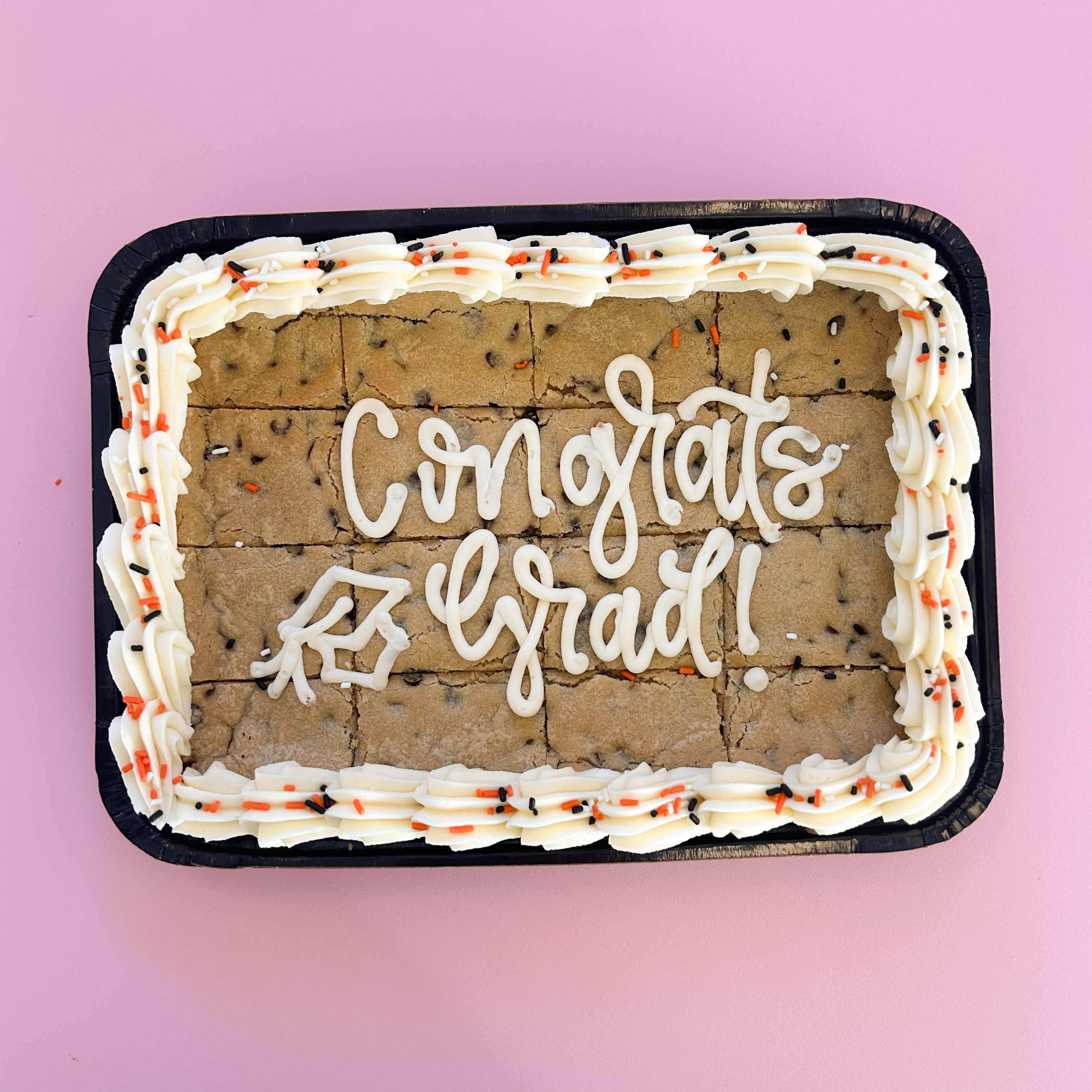 Our 9x13" rectangular Chocolate Chip Cookie Cake is pre-cut into 16 portions and features scratch-made cookie dough, baked to perfection and piped with "Congrats Grad!" in buttercream frosting and your choice of sprinkle colors. To customize sprinkle colors, please 1) place your pre-order online, then 2) email
