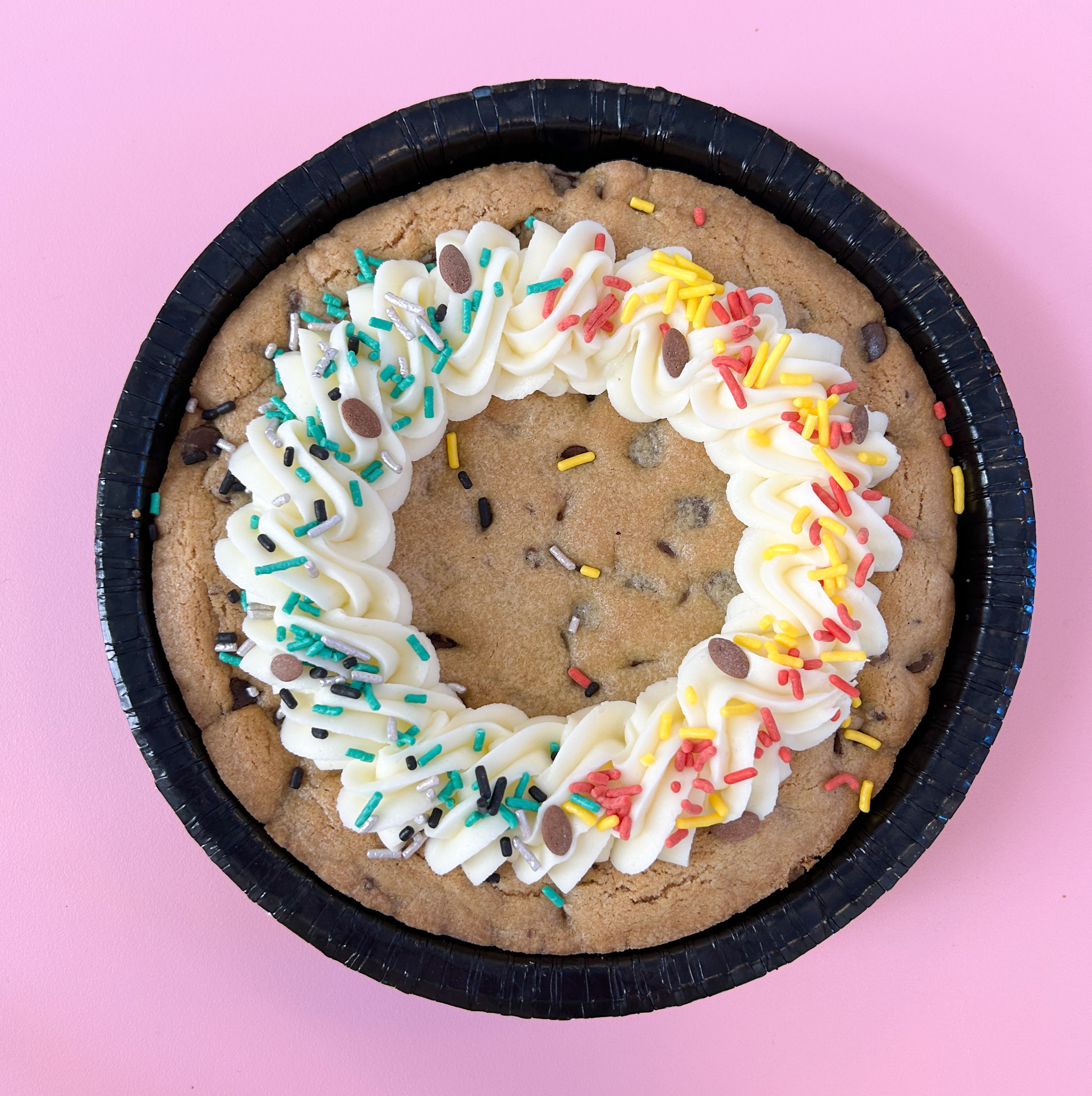 Only available for pickup Saturday, February 7th! 8" Chocolate Chip Cookie Cake piped with fresh buttercream frosting and sprinkled with half Seahawks/half Patriots themed sprinkle blends Photo example from 2025.