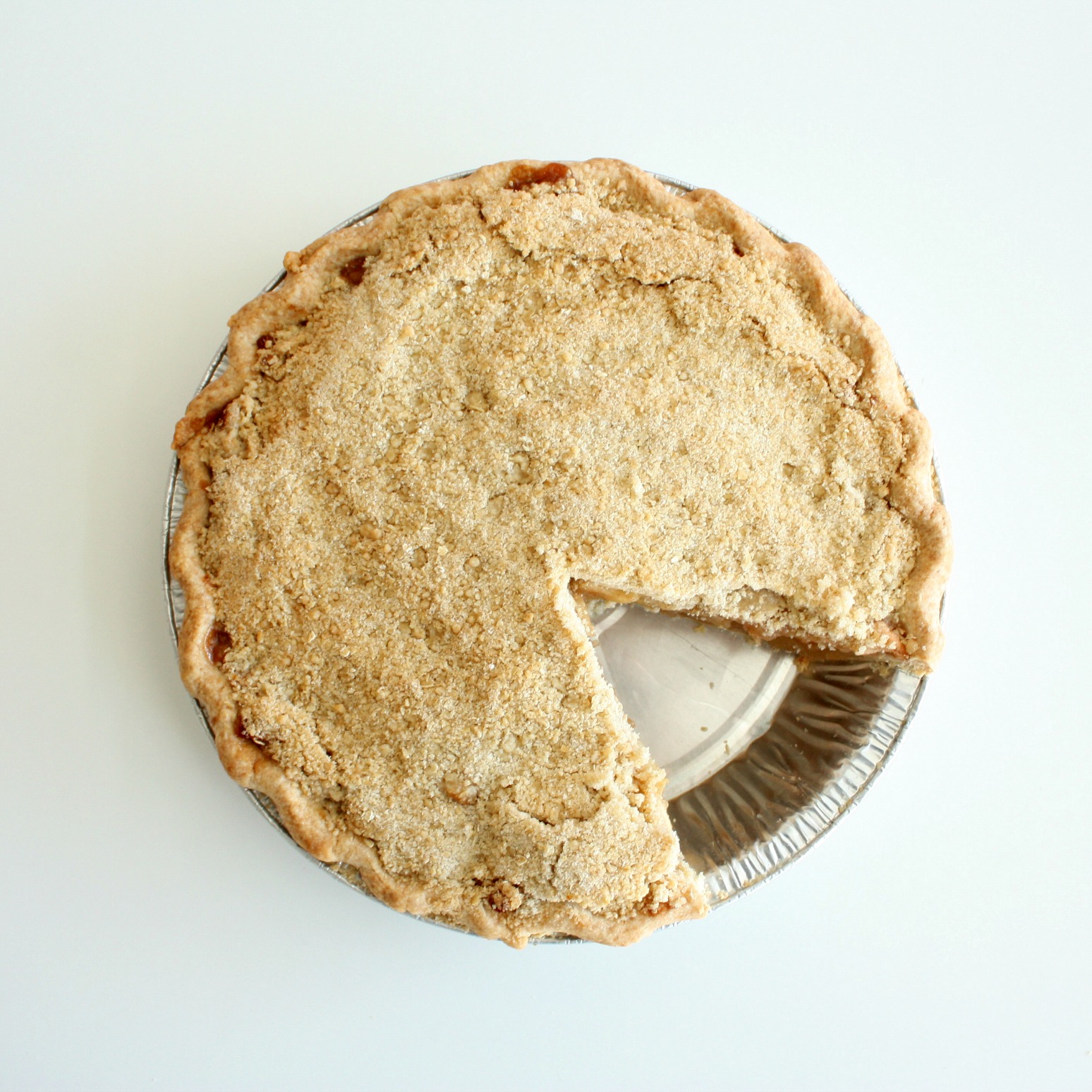 Our Take & Bake Apple Crumble pie is frozen, unbaked, so you can take it home and bake it off when you're ready to enjoy! Instructions included (bakes for more than one hour). Flaky crust filled with granny smith apples. Lightly sweetened with cinnamon & sugar and topped with our brown sugar oat crumble. Note: our apples are not cooked into a gel filling like you might find in a can! Whole pies available with a pre-order.