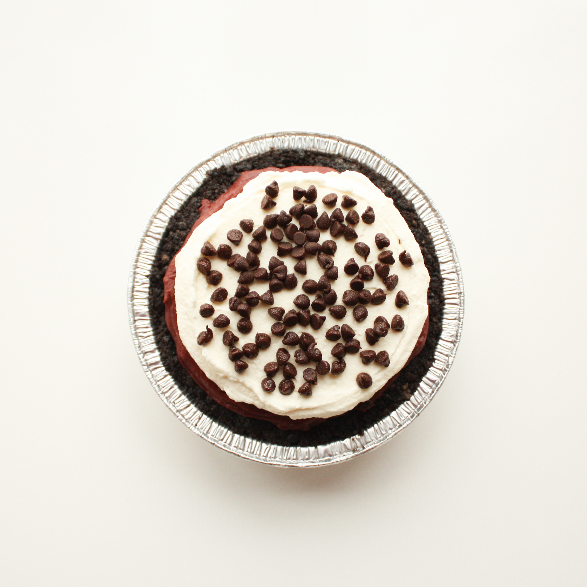 Our Seasonal Red Velvet Cream Pie in a 6" sharable cutie pie size, only available in February! Oreo crust layered with chocolate ganache, red velvet pastry cream and topped with fresh whipped cream & mini chocolate chips. Does not freeze well. Only available Feb 13-14.