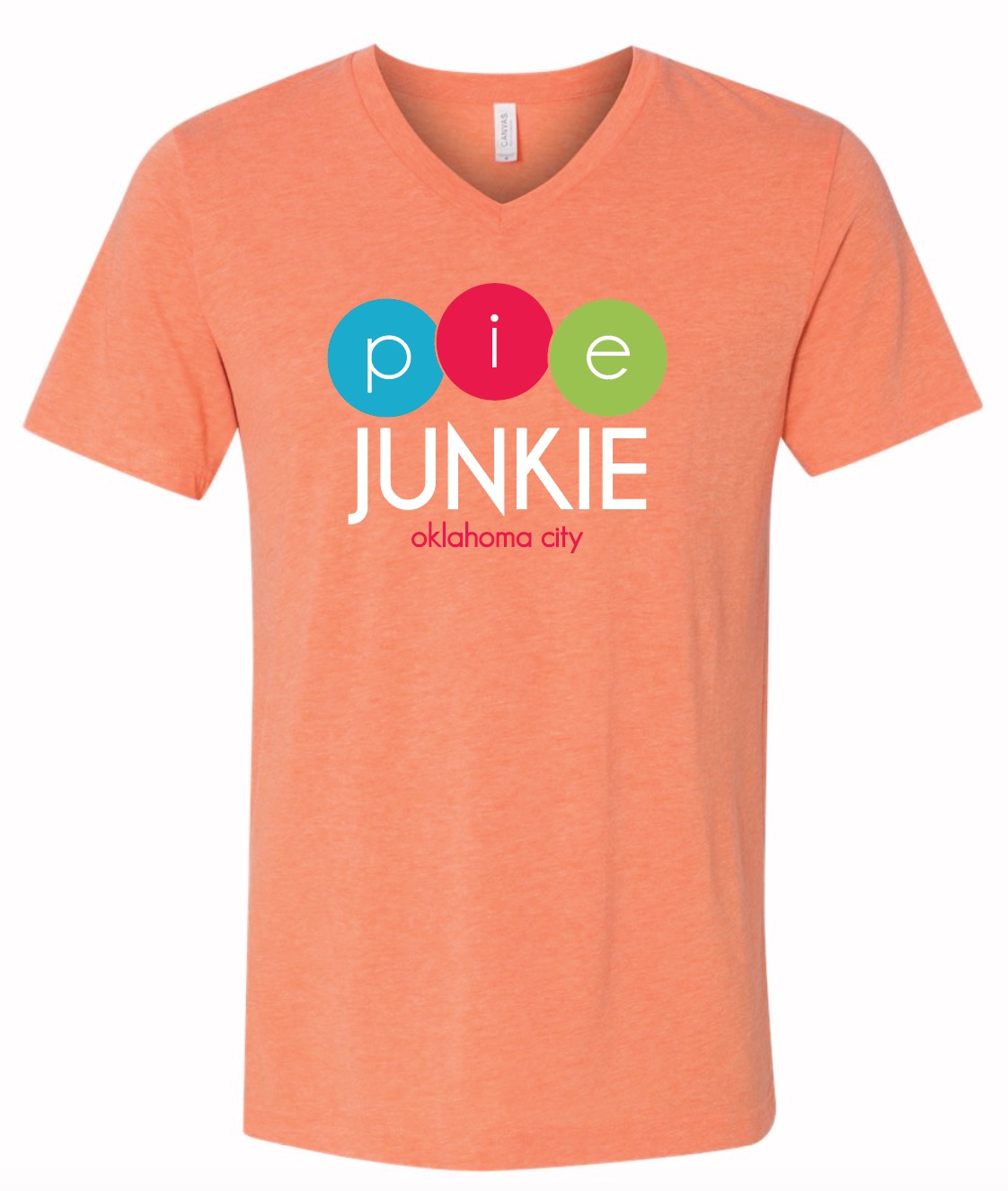 Bella + Canvas - Unisex Triblend V-Neck Short Sleeve Tee - Orange Triblend with full color Pie Junkie logo. Shop pickup only.