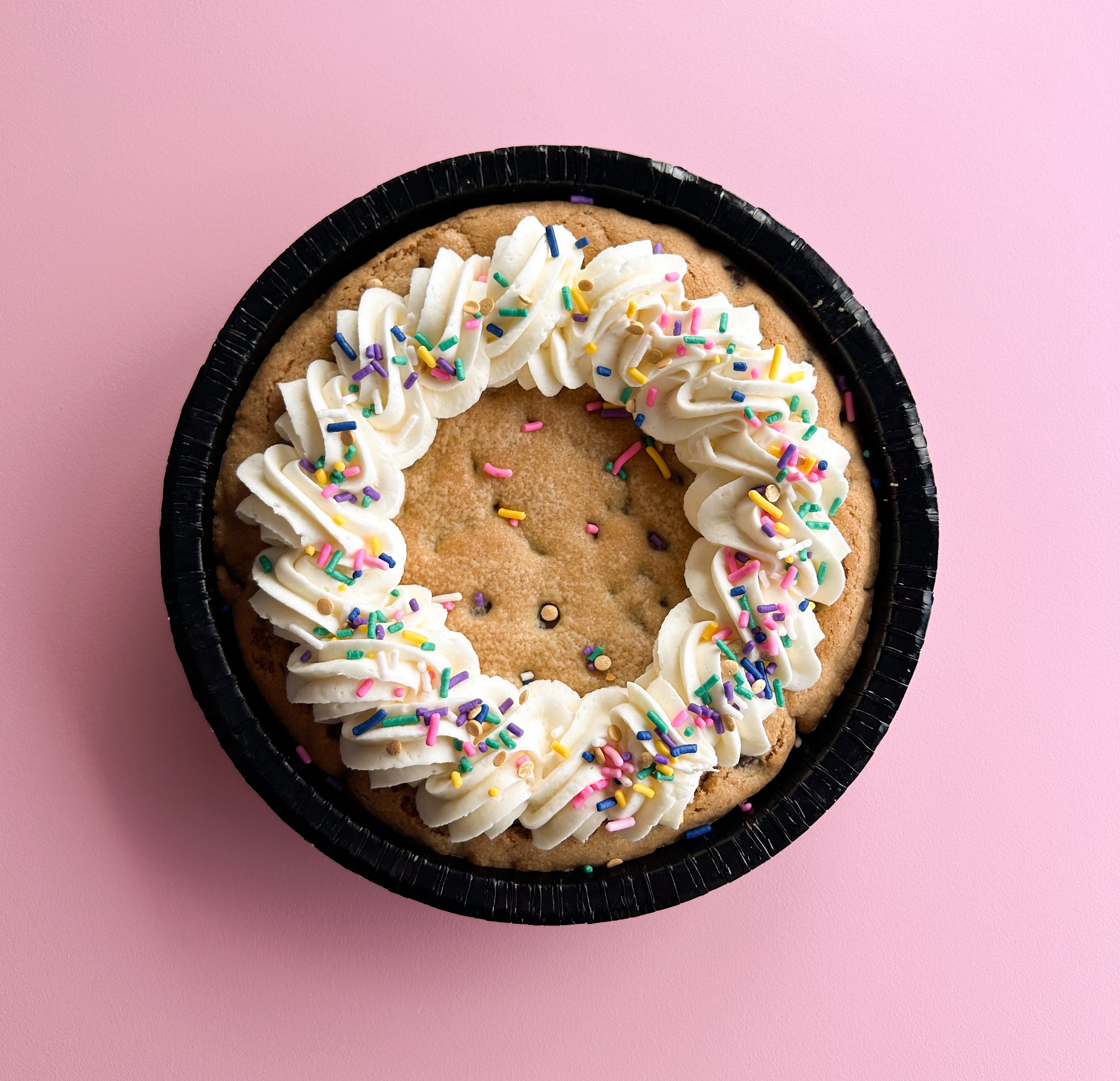 Our 8" Chocolate Chip Cookie Cake serves 4-6 and features scratch-made cookie dough, baked to perfection and topped with fresh buttercream frosting & sprinkle blend.